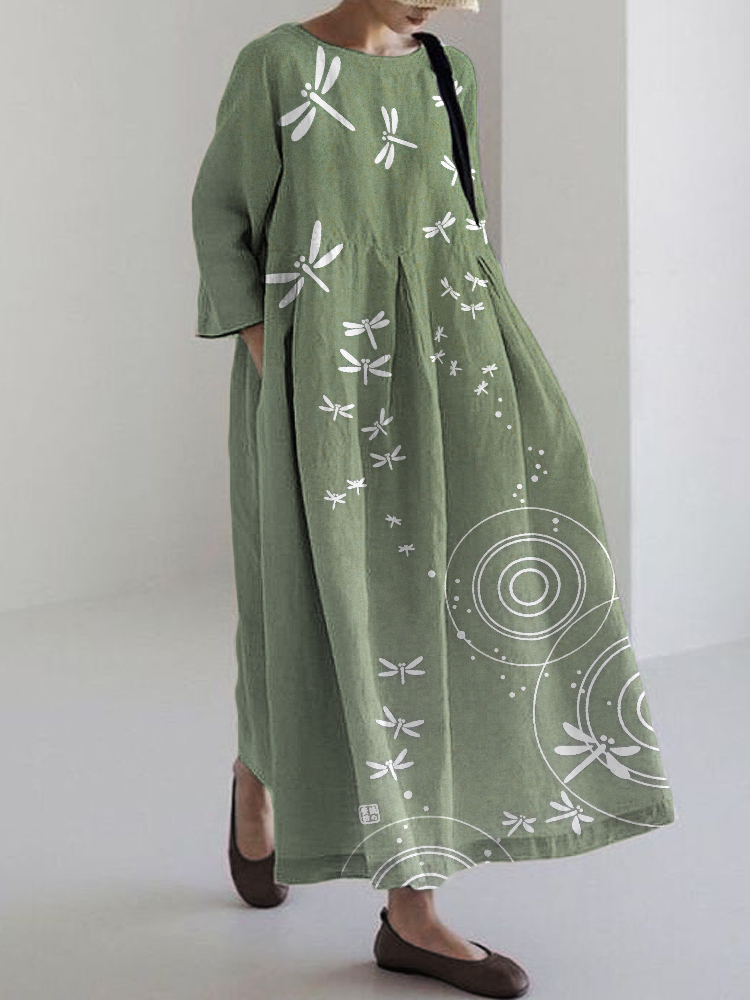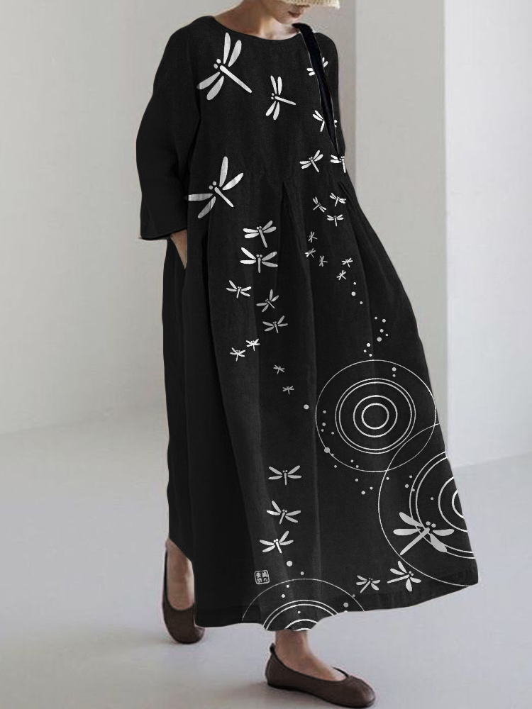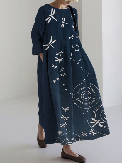 Dragonflies & Ripples Japanese Art Linen Blend Maxi Dress