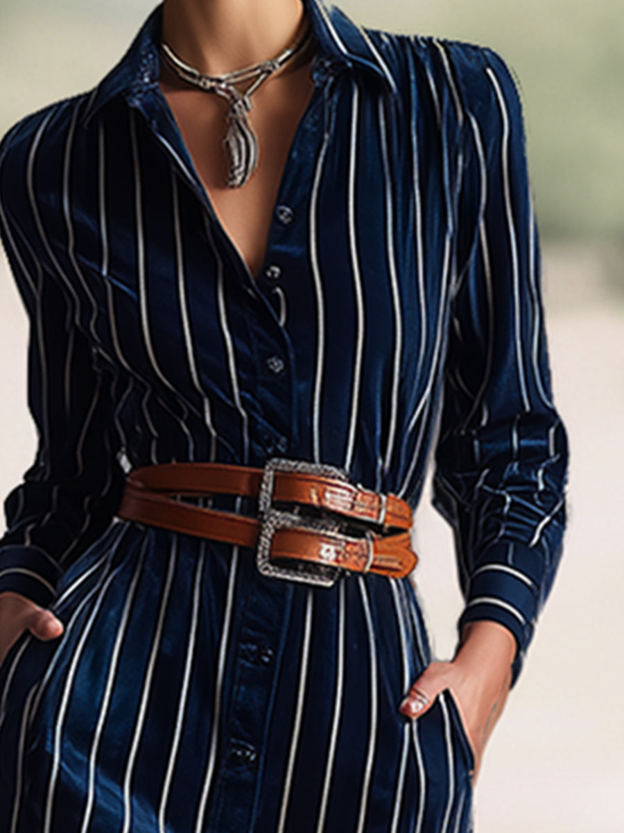 Elegant And Classic Navy Blue Striped Printed Velvet Lapel Maxi Dress