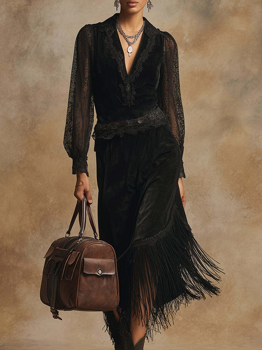 Elegant And High-end Tassel Black Faux Suede Lace Long-sleeved Maxi Dress
