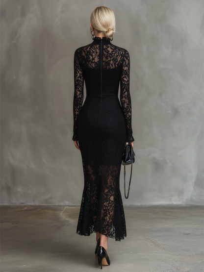 Elegant Party Black Stretch Lace Fishtail Maxi Dress