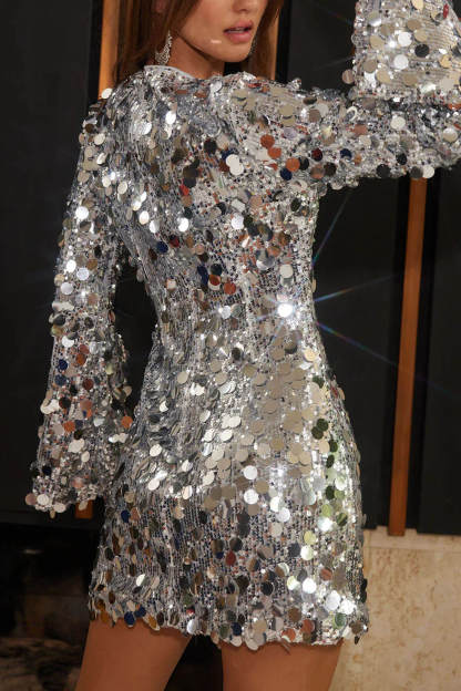Fashionable Large Sequins Long Bell Sleeve H-line Mini Dress