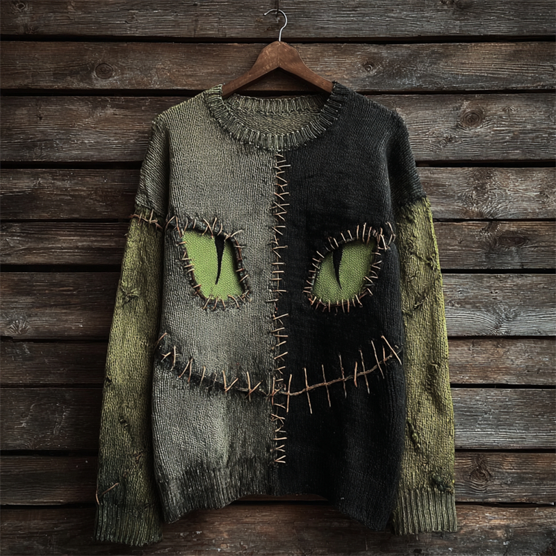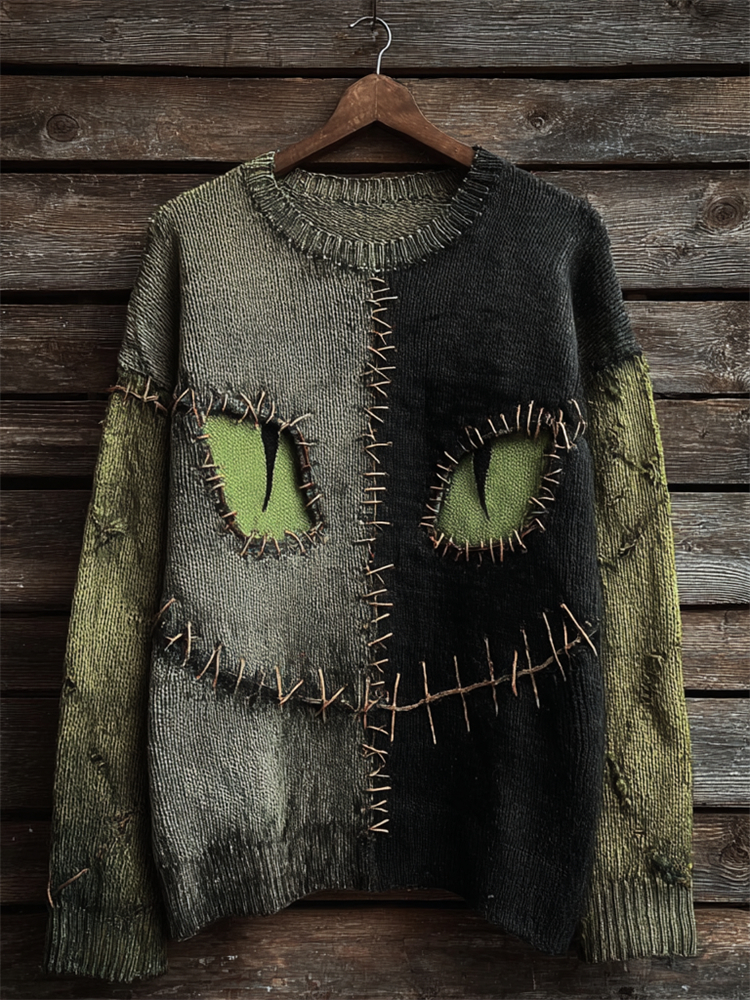 Halloween Black Cat Face Contrast Stitched Cozy Knit Sweater