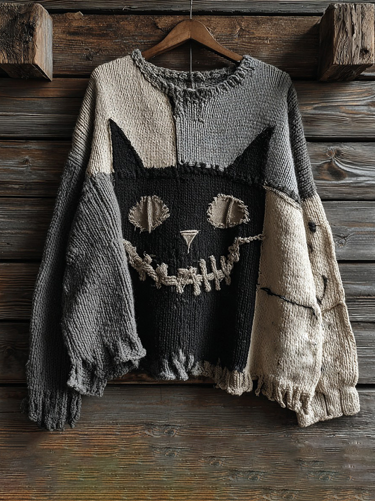 Halloween Black Cat Spooky Face Contrast Stitched Cozy Knit Sweater