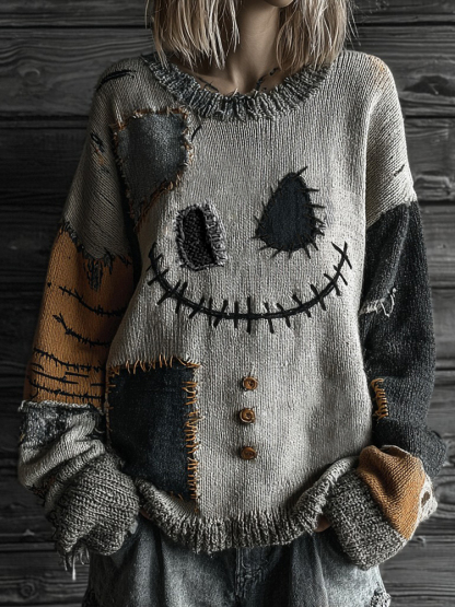 Halloween Spooky Face Contrast Stitched Cozy Knit Sweater