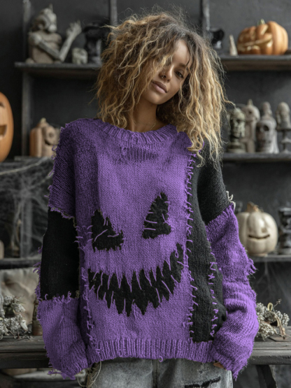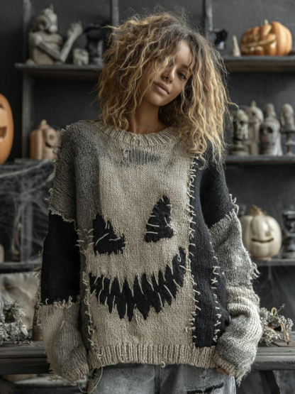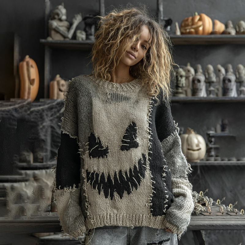 Halloween Spooky Face Contrast Stitched Cozy Knit Sweater