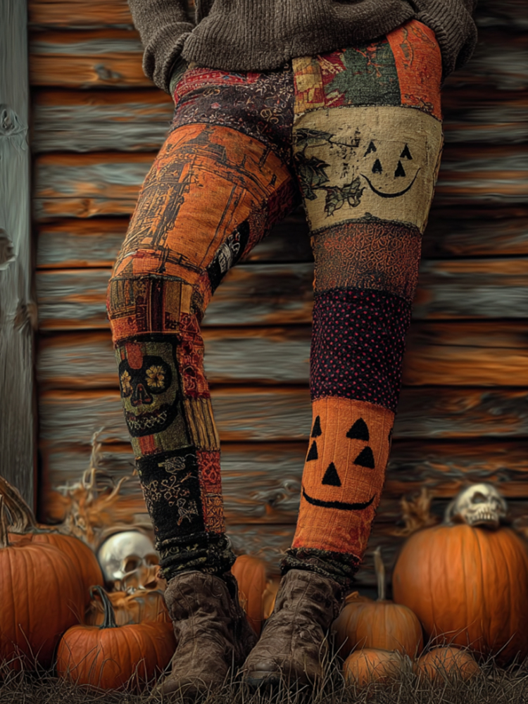 Halloween-themed Knitted Pants With A Patchwork Of Pumpkin-colored Blocks