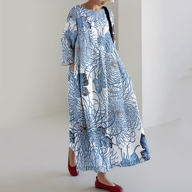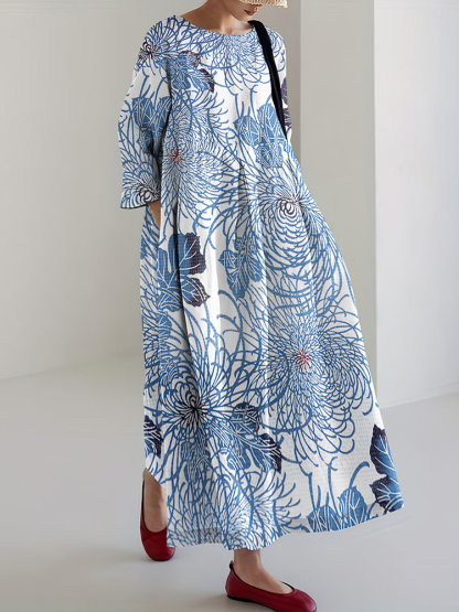 Japanese Art Chrysanthemum Print Loose Midi Dress