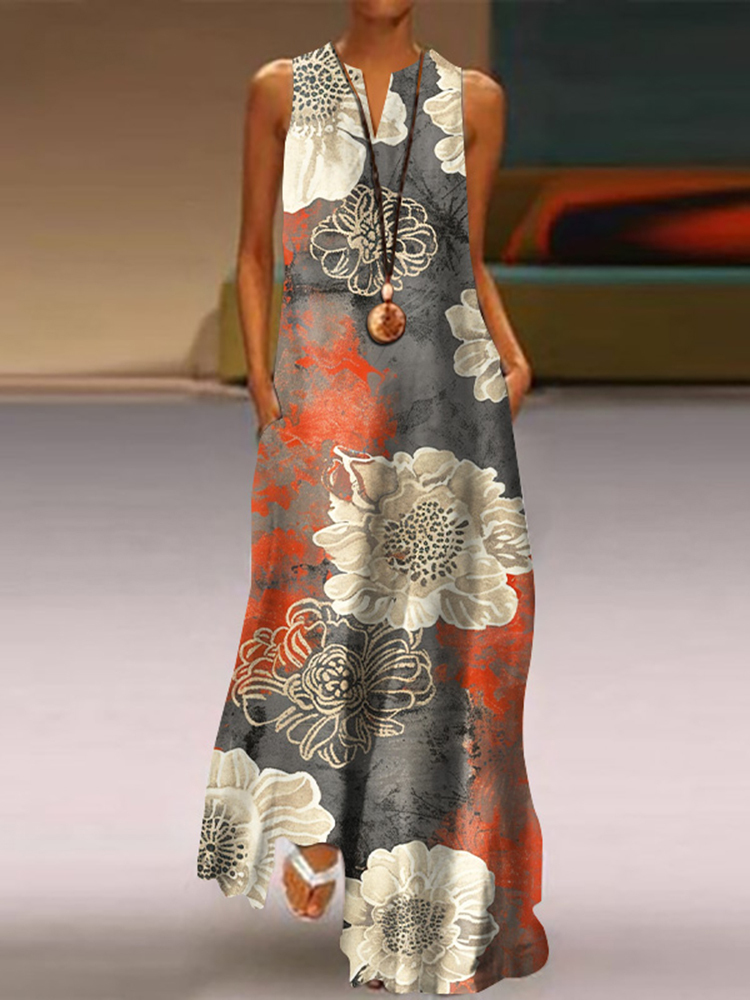 Japanese Art Flower Print V-Neck Sleeveless Maxi Dress