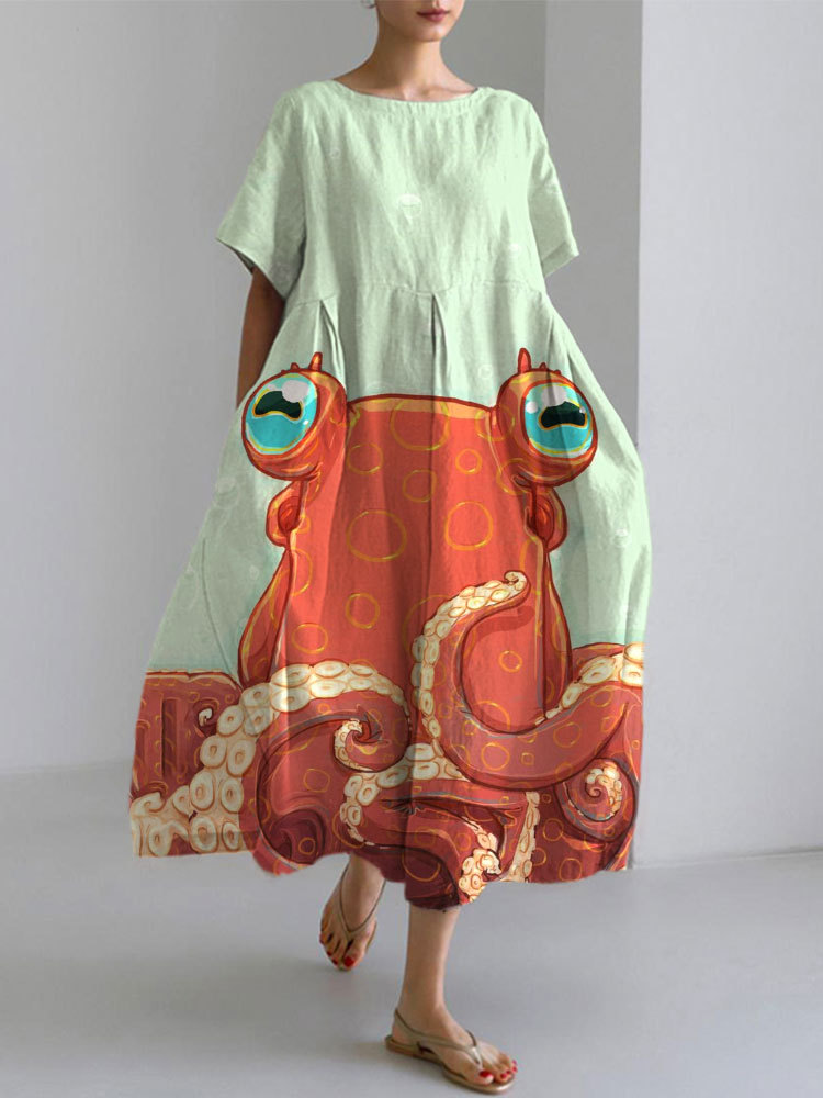 Japanese Art Ocean Octopus Print Cotton Blend Dress