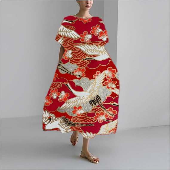 Japanese Chiyogami Crane & Cherry Blossom Art Linen Blend Maxi Dress