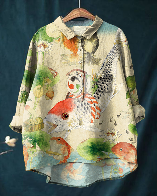 Japanese Whale Art Casual Cotton and Linen Shirt