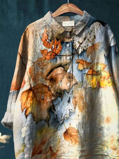 Leaves Art Printed Women's Casual Cotton And Linen Shirt