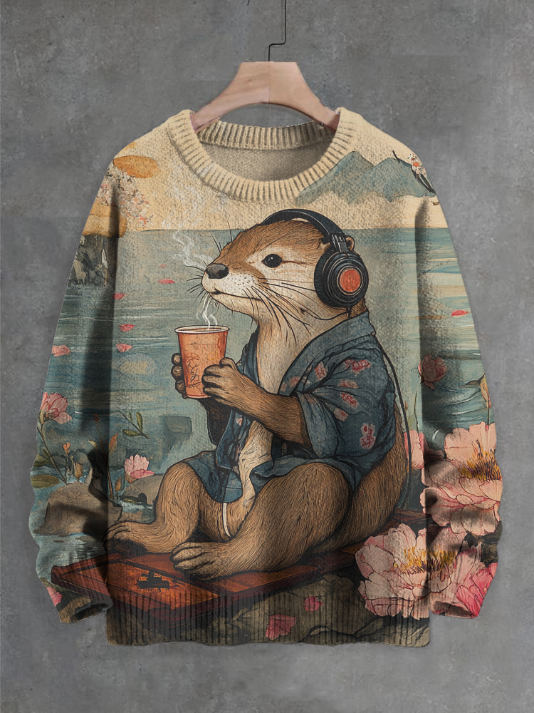 Men's Kimono Otter Listening To Music Art Print Knit Sweatshirt