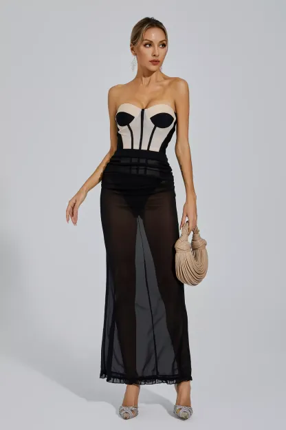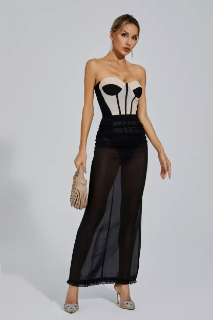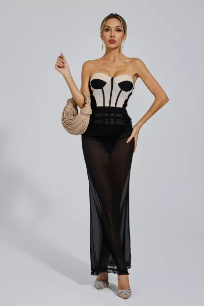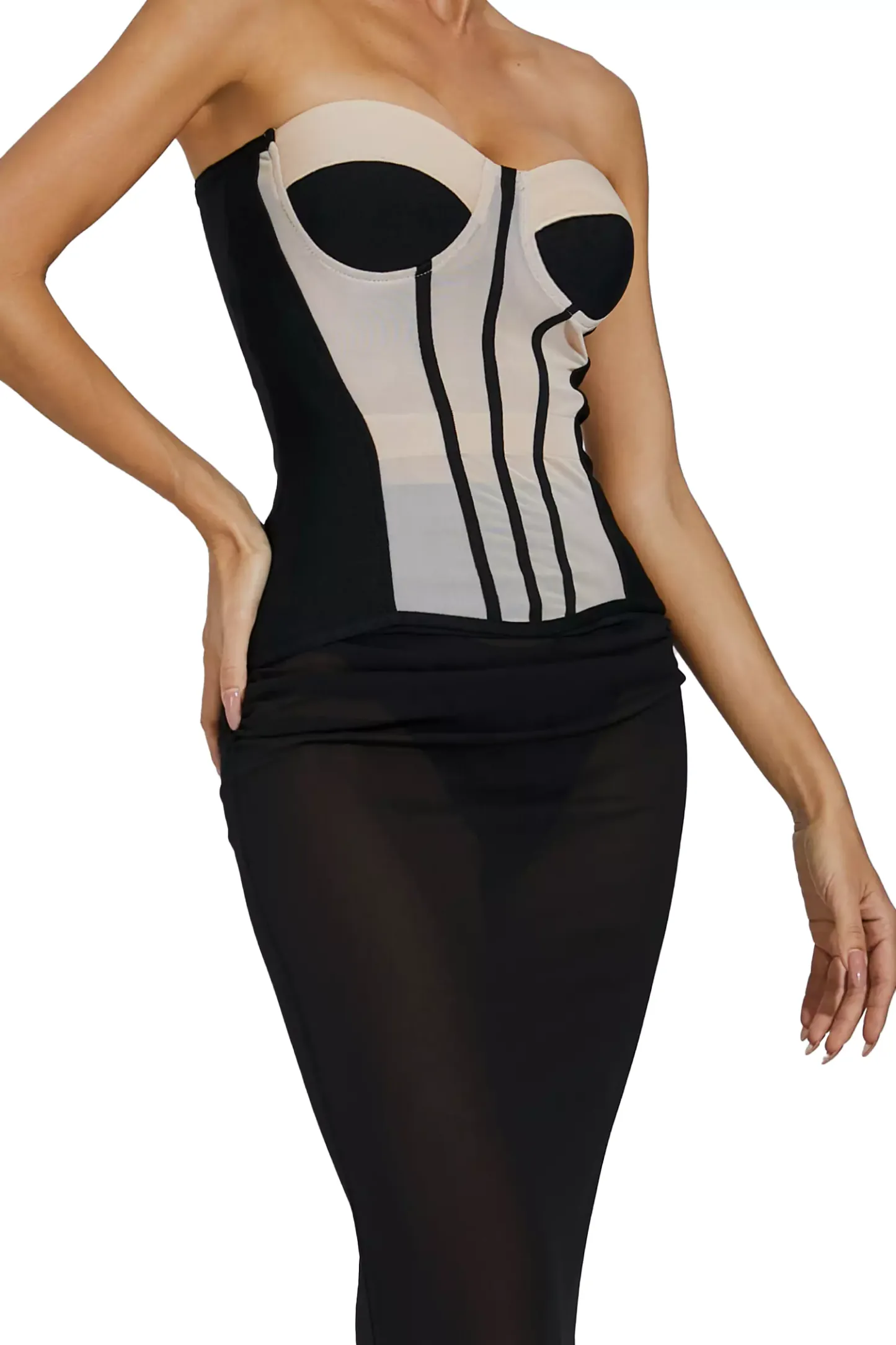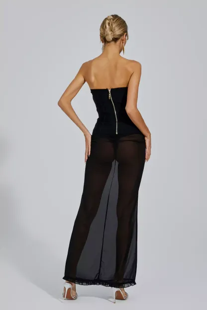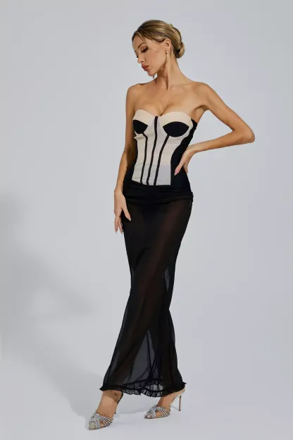 Enhance your style quotient with the Black Bandage Bustier Set. This fashionable two-piece ensemble features a black bandage bustier and a black chiffon maxi skirt. Perfect for both formal events and casual outings, this set effortlessly combines elegance and leisure. Elevate your wardrobe and make a statement with this chic and trendy outfit.