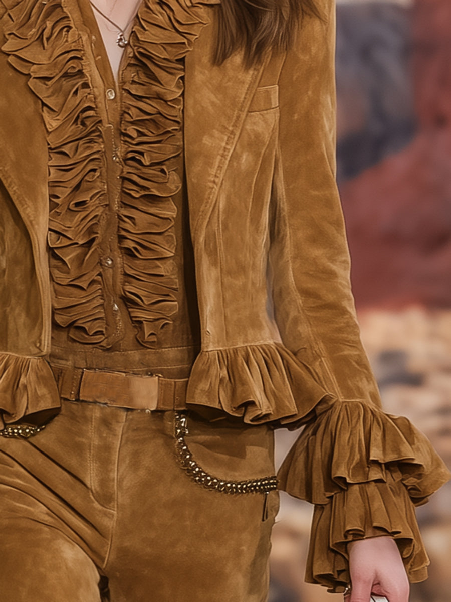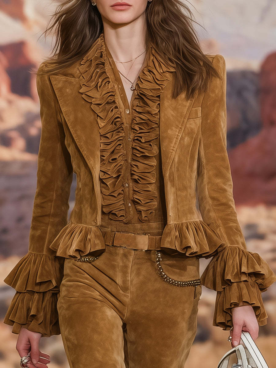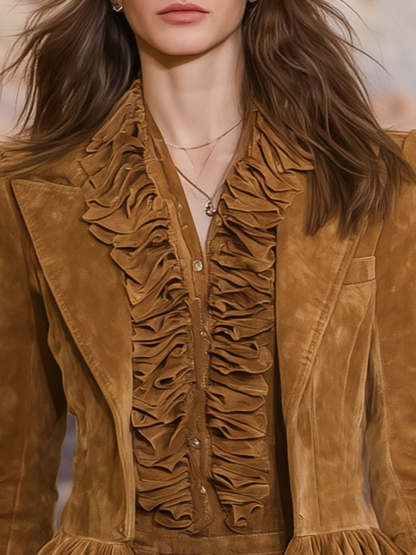 Retro Casual Brown Faux Suede Ruffled Blazer