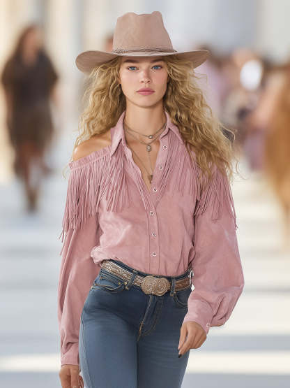 This retro casual pink shirt features a unique design, perfectly combining a faux suede collar with an off-shoulder cut. The soft pink hue accentuates its feminine charm, while the fringe adds a touch of playful dynamism. This shirt perfectly blends retro charm with modern style.