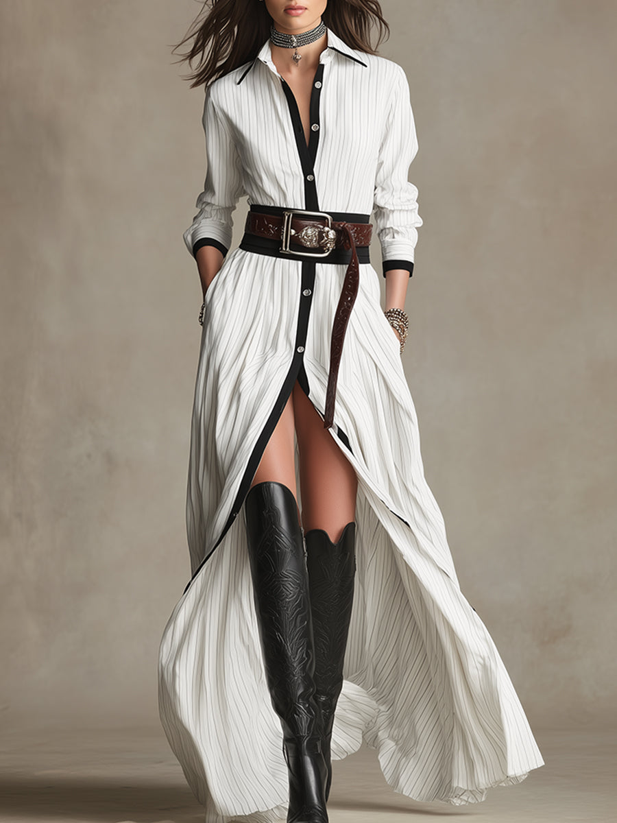 This retro-chic white striped maxi dress with contrasting color-piped trim and a front opening perfectly blends classic vintage charm with modern elegance. The stunning vertical stripes elongate the figure, creating a sophisticated yet casual style that perfectly embodies both classic and contemporary aesthetics.