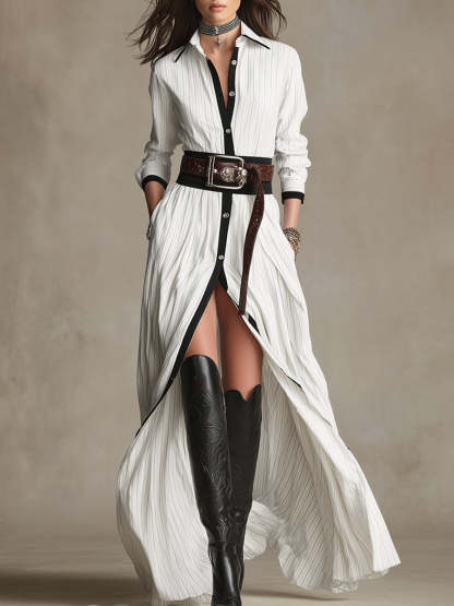 Retro-chic Color-blocked Trimmed White Striped Front Button Maxi Dress