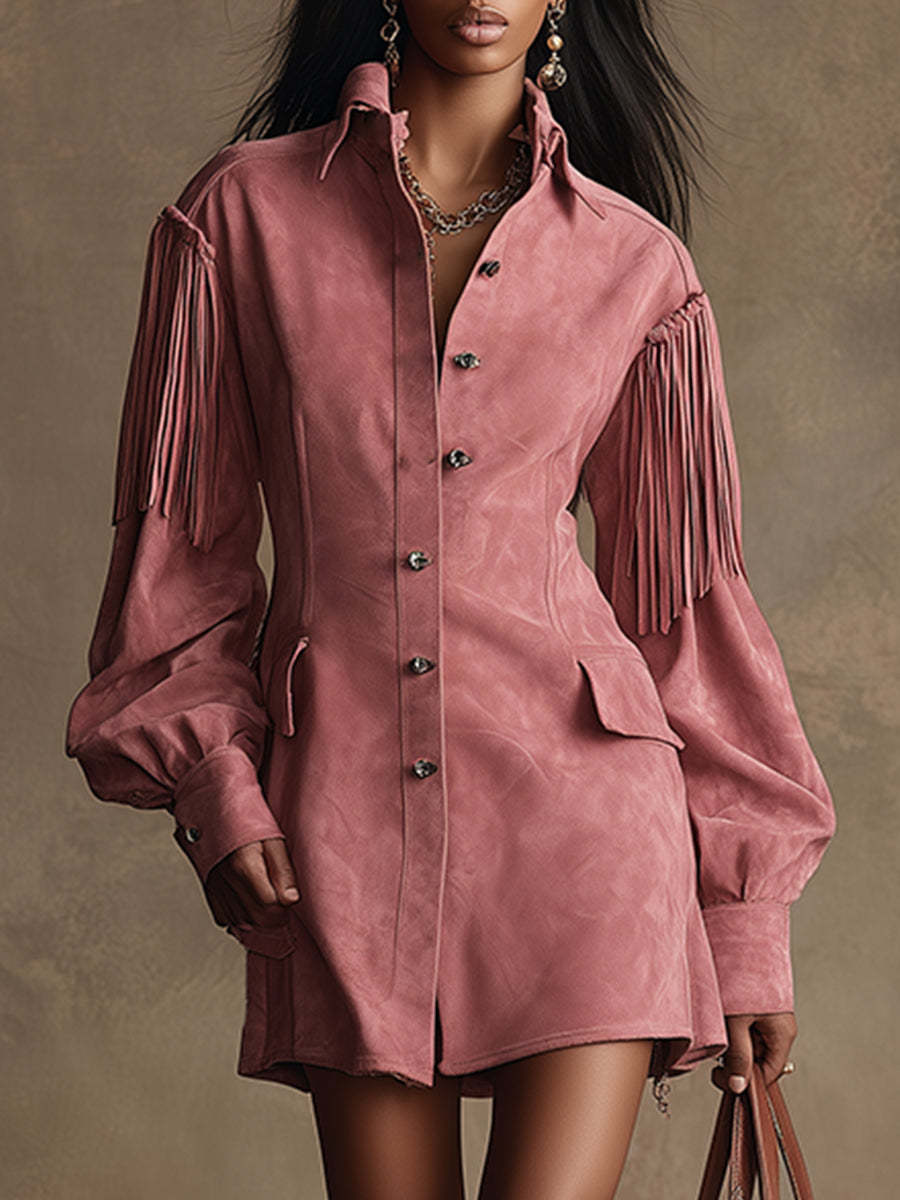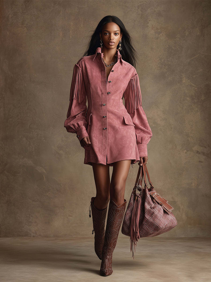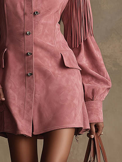 Introducing our retro-chic fringed pink faux suede long-sleeved mini dress, a perfect blend of vintage elegance and modern style. This dress stands out with its unique fringed details and vibrant pink color, exuding a playful yet sophisticated charm, suitable for various occasions.