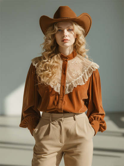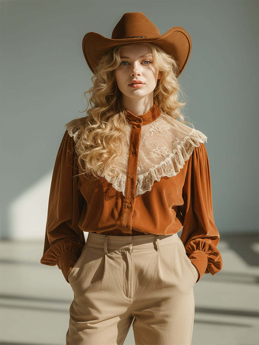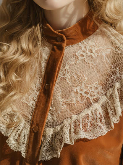 Retro-chic Lace-trimmed Pumpkin-colored Velvet Shirt