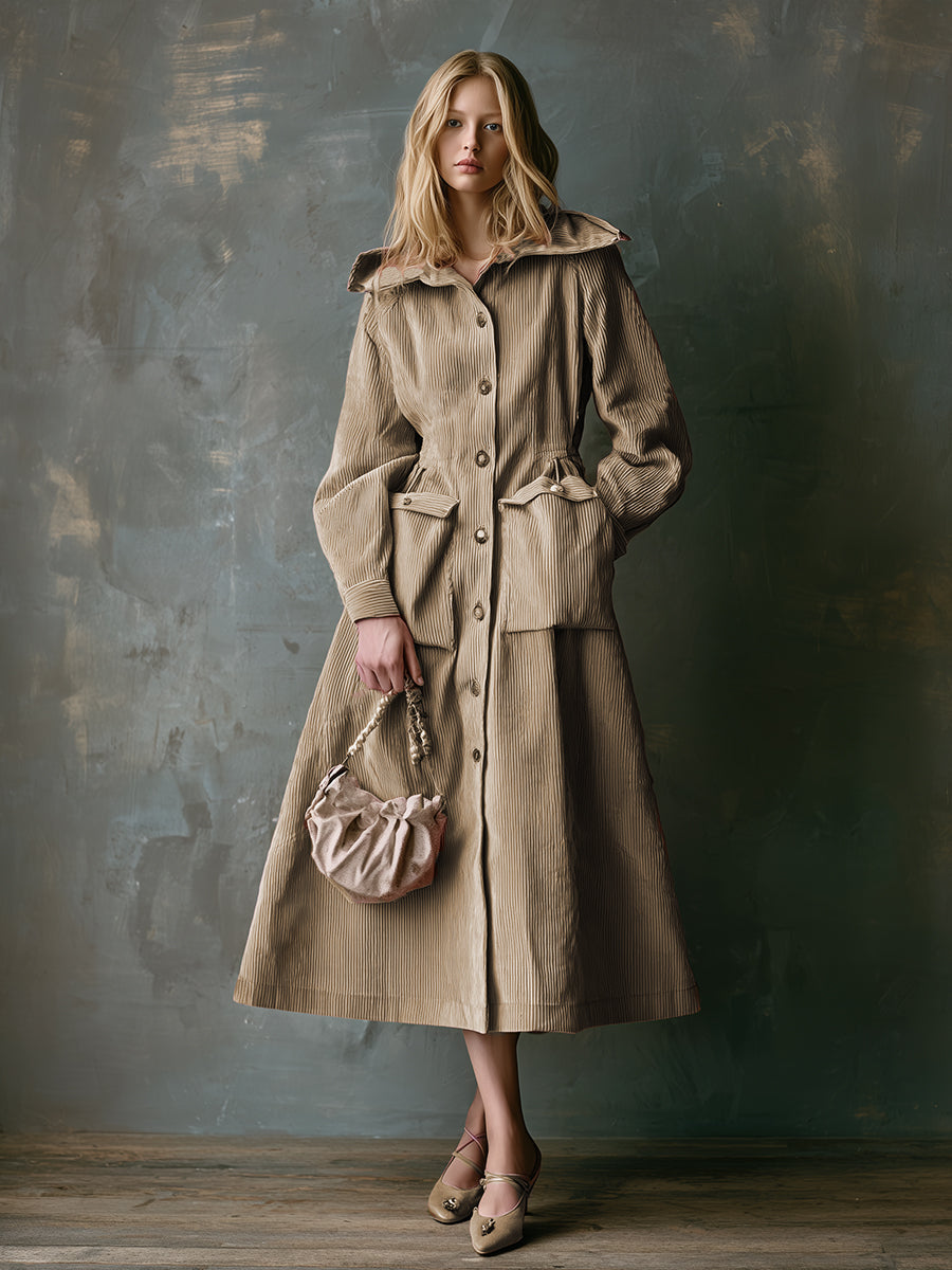 Retro Khaki Hooded Front Button A-line Maxi Dress