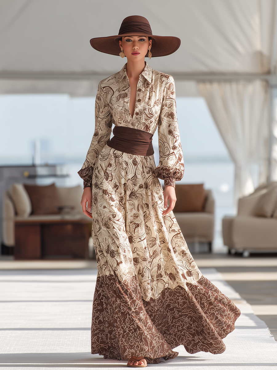 A retro print elegant long‑sleeved shirt dress combines classic sophistication with vintage allure. The timeless shirt‑dress silhouette, featuring a button‑front design and structured collar, is elevated by the intricate retro print that adds personality and artistic flair. Crafted from soft, flowing fabric, it drapes beautifully to flatter the figure while maintaining a polished, effortlessly chic appearance suitable for day or evening wear.