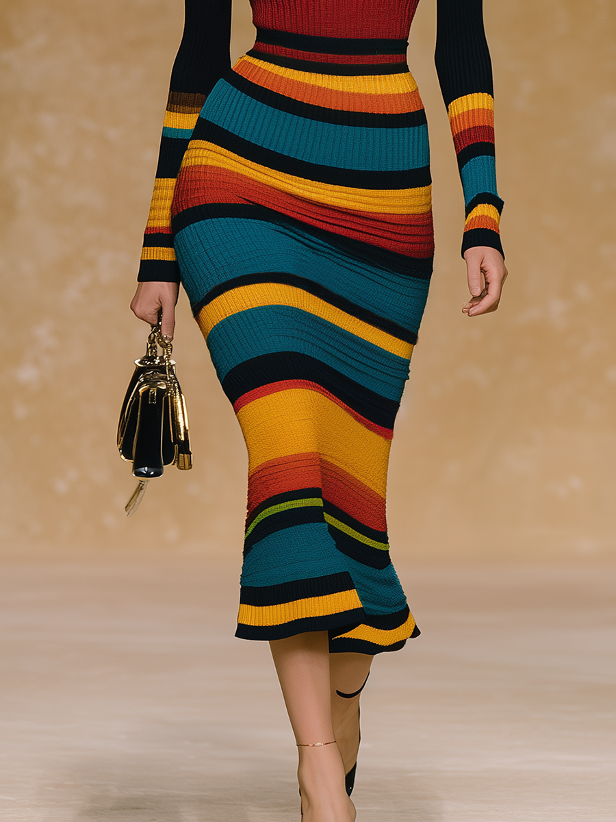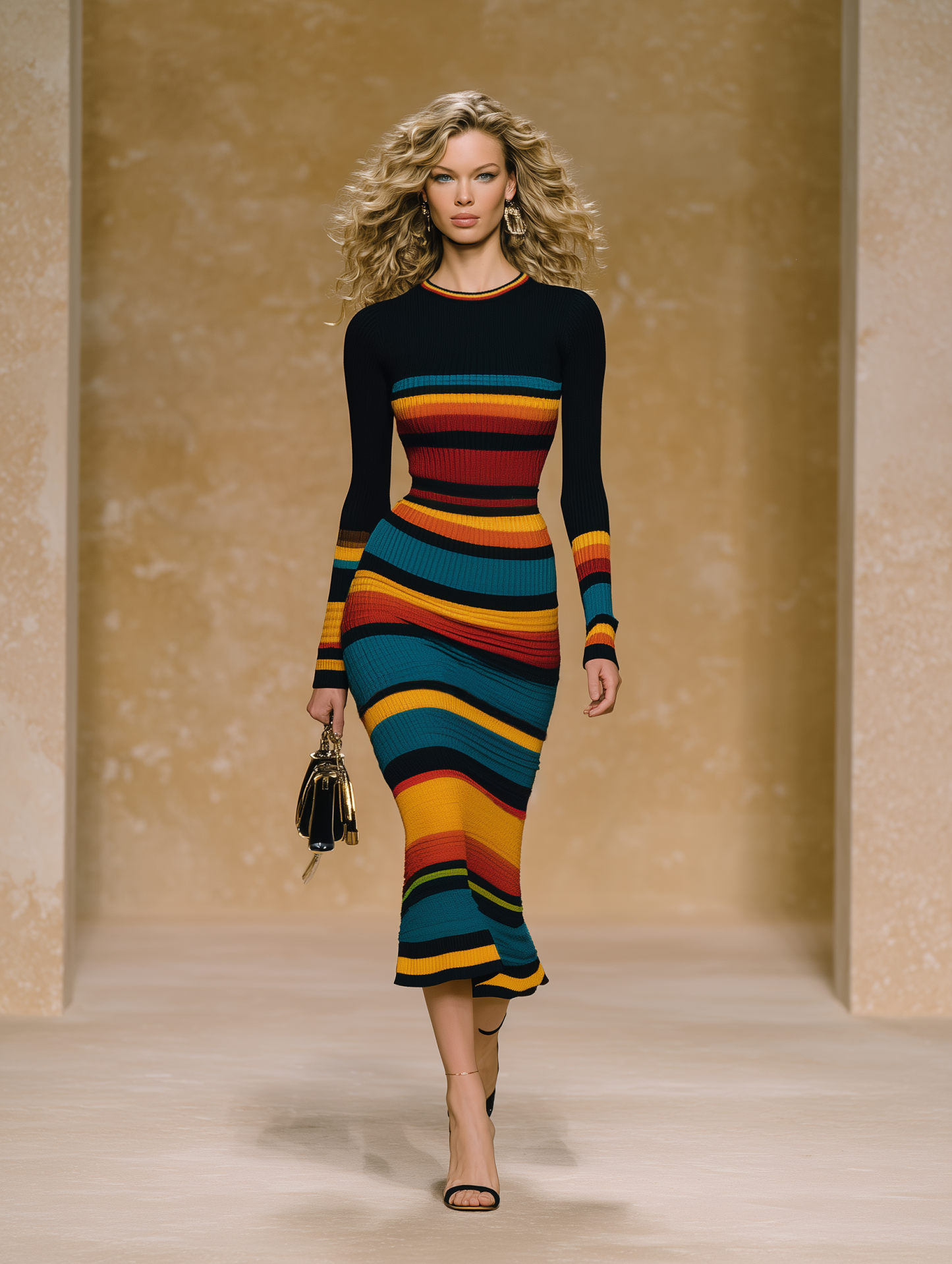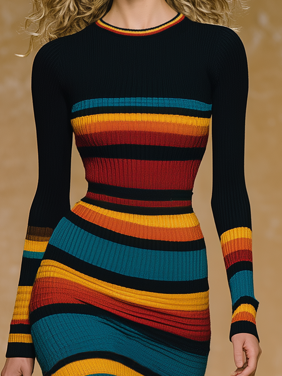 This retro slim‑fit colorful striped round neck midi dress channels vibrant vintage inspiration through a modern, body‑hugging silhouette. Crafted from a smooth, stretchy knit or jersey fabric, it flatters the figure while maintaining full comfort and ease of movement. The round neckline and mid‑length sleeves highlight its classic simplicity, allowing the bold colorful stripes to take center stage — a harmonious mix of retro hues that bring playful energy and visual rhythm.