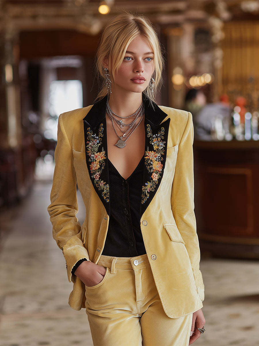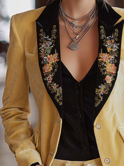 This retro-style, warm-toned, color-blocked, light yellow velvet embroidered blazer is a must-have for those who love classic style but also appreciate a modern feel. Its unique design, high-quality fabric, and exquisite details make it the perfect choice for anyone wanting to express their fashion sense.
