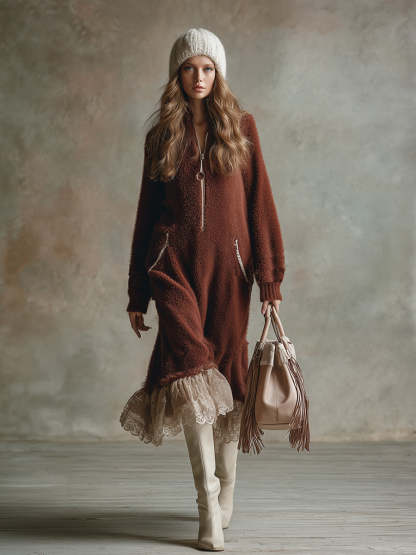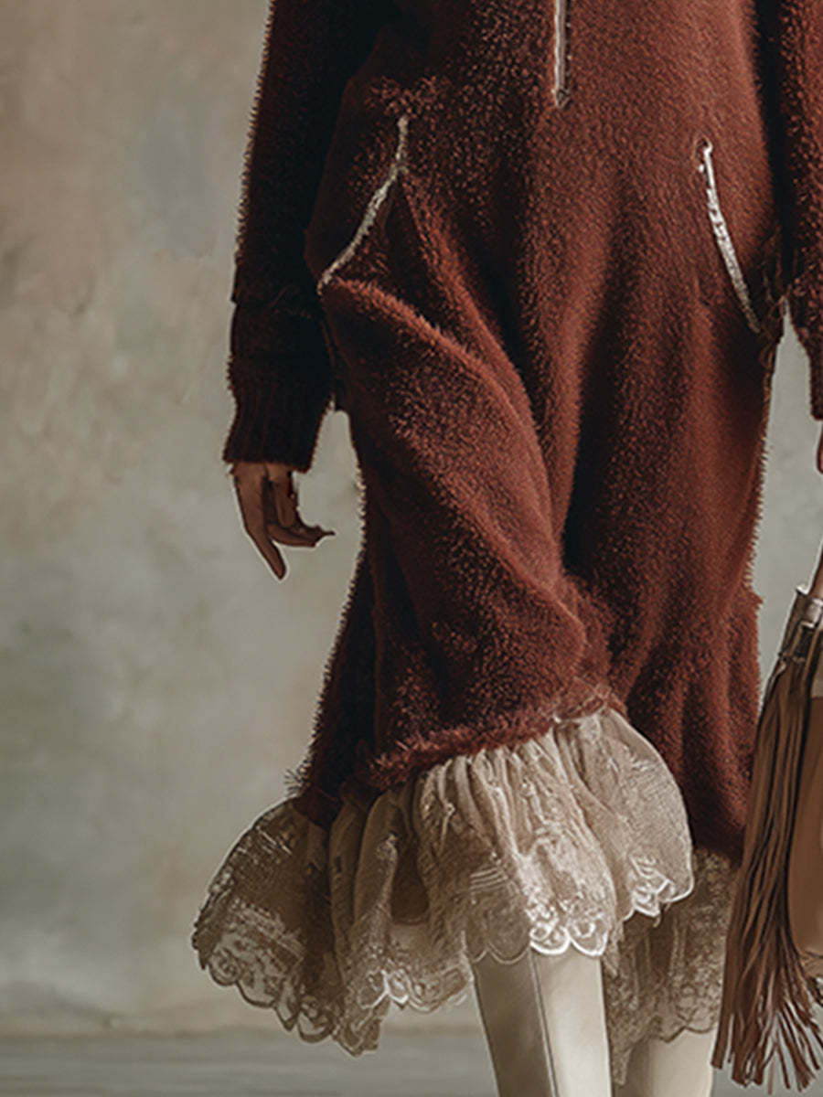 Retro-style Warm Lace Hem Brown-red Mohair Knit Midi Dress