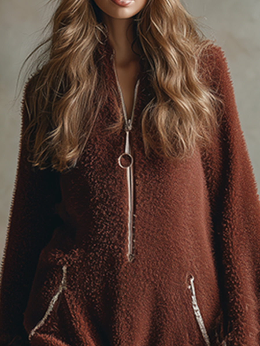 This vintage-inspired, warm lace-trimmed, brown-red mohair knit midi dress blends retro elegance with modern comfort, making it ideal for all occasions. Its classic design and comfortable fabric ensure you stay warm and stylish throughout the season.