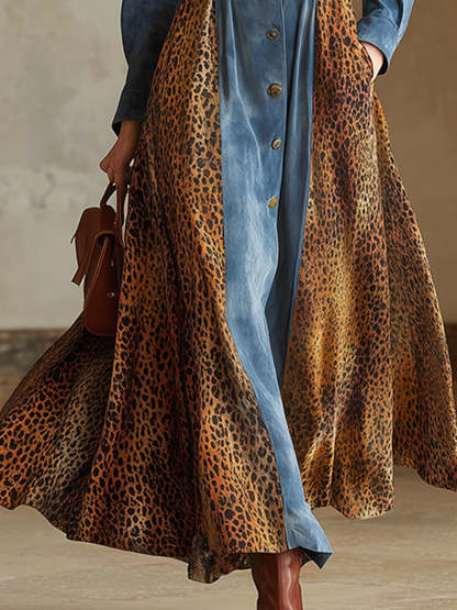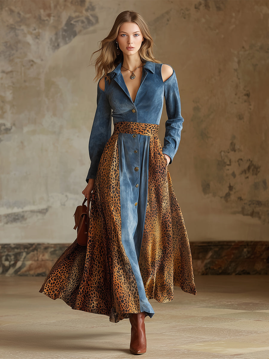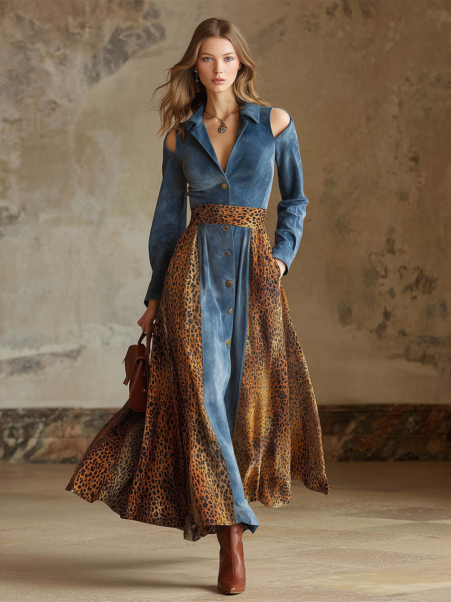 Retro Western Blue Patchwork Leopard Print Faux Suede Maxi Dress