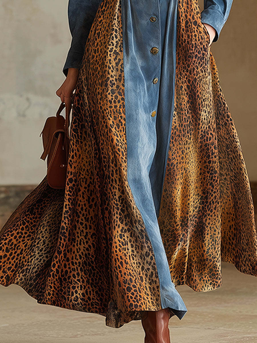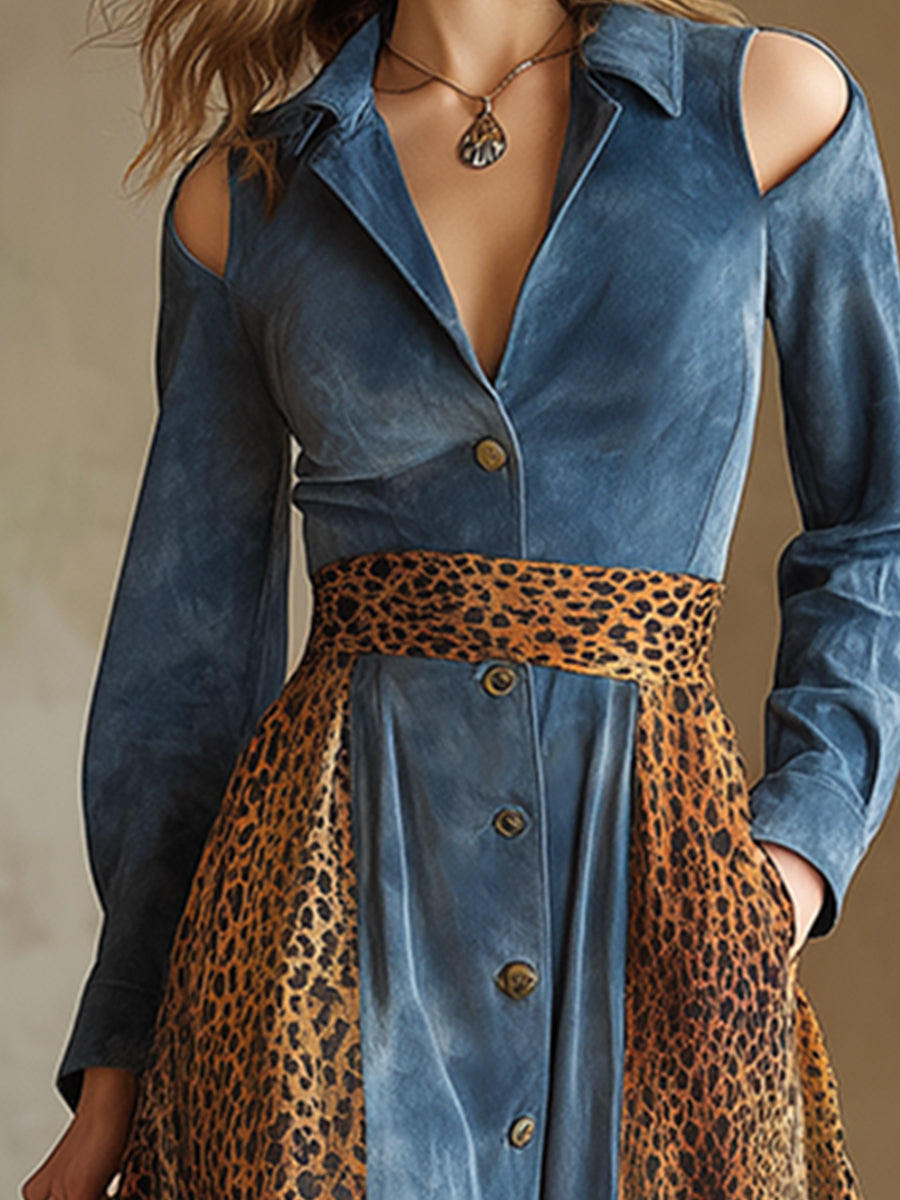 This retro Western-style blue leopard print faux suede maxi dress cleverly blends classic Western style with modern fashion elements. The bold leopard print patchwork and vintage faux suede texture combine perfectly to create a must-have wardrobe item that will turn heads.