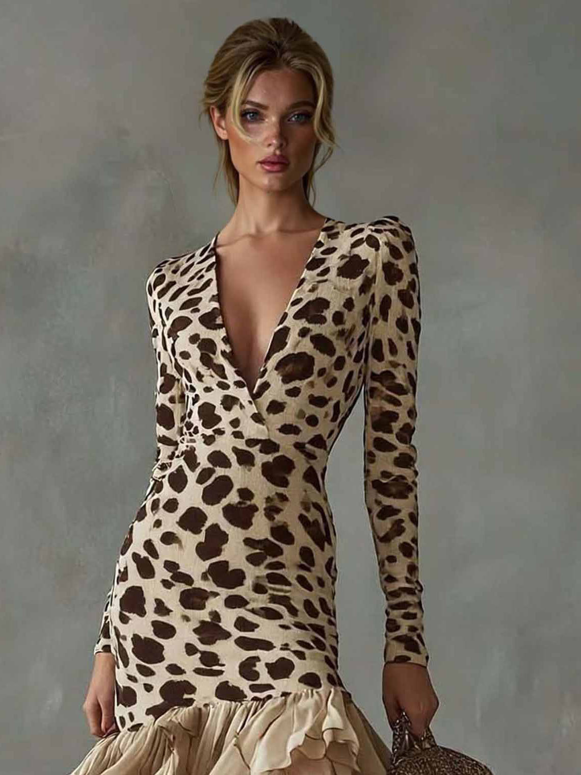 A flowy printed maxi dress featuring a romantic V-neckline and delicate ruffled detailing. The lightweight silhouette moves gracefully with every step, making it perfect for vacations, garden parties, or elegant daytime outings.
