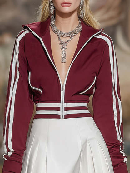 The Stand-Up Collar Zip-Up Color-Blocked Sweatshirt and Skirt Set redefines sporty elegance with its dynamic design and coordinated appeal. Crafted from soft, mid-weight fabric, the set features a modern zip-up sweatshirt with a structured stand-up collar for an athletic touch. Contrasting color-block panels add visual interest, while the matching skirt balances the look with a feminine silhouette. Perfect for casual outings or travel days, it offers comfort and trend-forward style in one sleek ensemble.