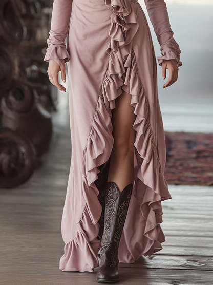 Stylish And Elegant Sporty Pink V-neck Ruffled Sweatshirt Maxi Dress