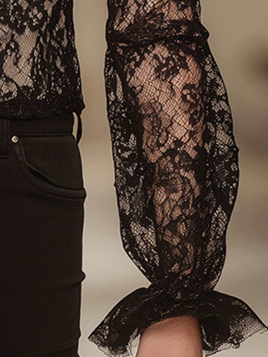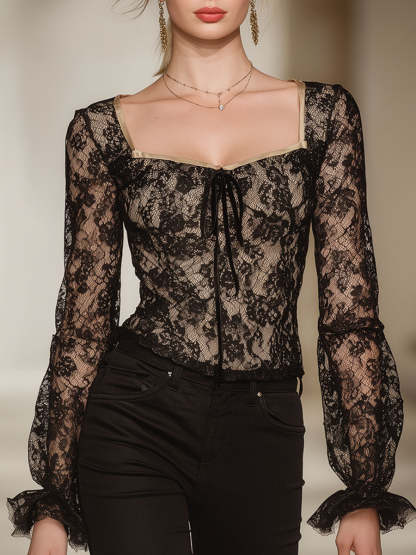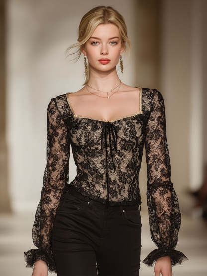 The silhouette of the blouse often features a fitted bodice, which accentuates the waist and flows into more relaxed sleeves, creating a balanced look that is both graceful and bold. The sleeves may be sheer, offering a tantalizing glimpse of skin while maintaining a sense of sophistication. Versatile and chic, this blouse can transition effortlessly from day to night. Pair it with high-waisted trousers or a sleek skirt for a polished daytime ensemble, or elevate it with statement jewelry and fitted jeans for an evening look that combines allure and style seamlessly. The black lace square-neck blouse is a testament to the enduring charm of lace, reimagined with contemporary design elements that make it a wardrobe essential.
