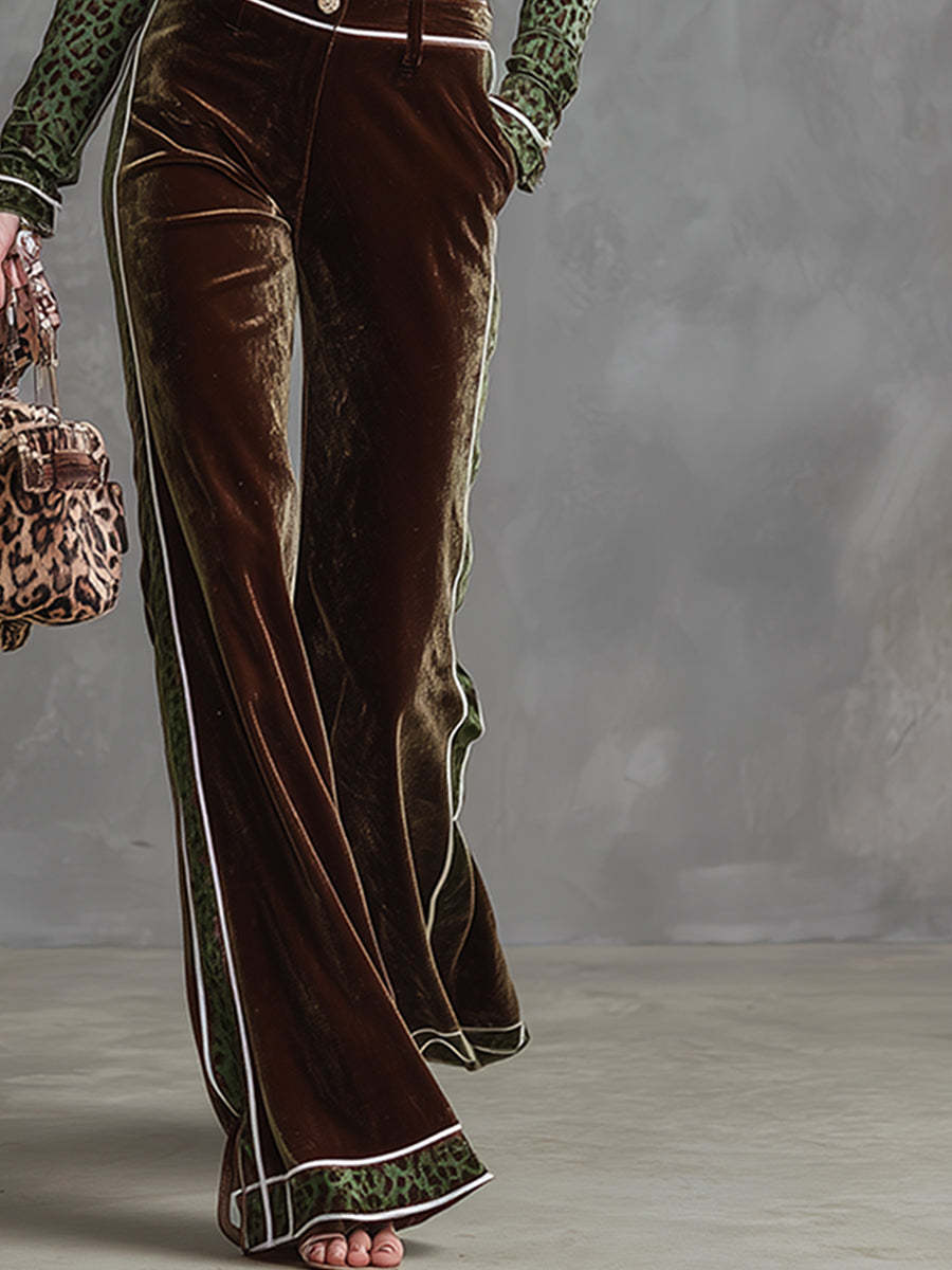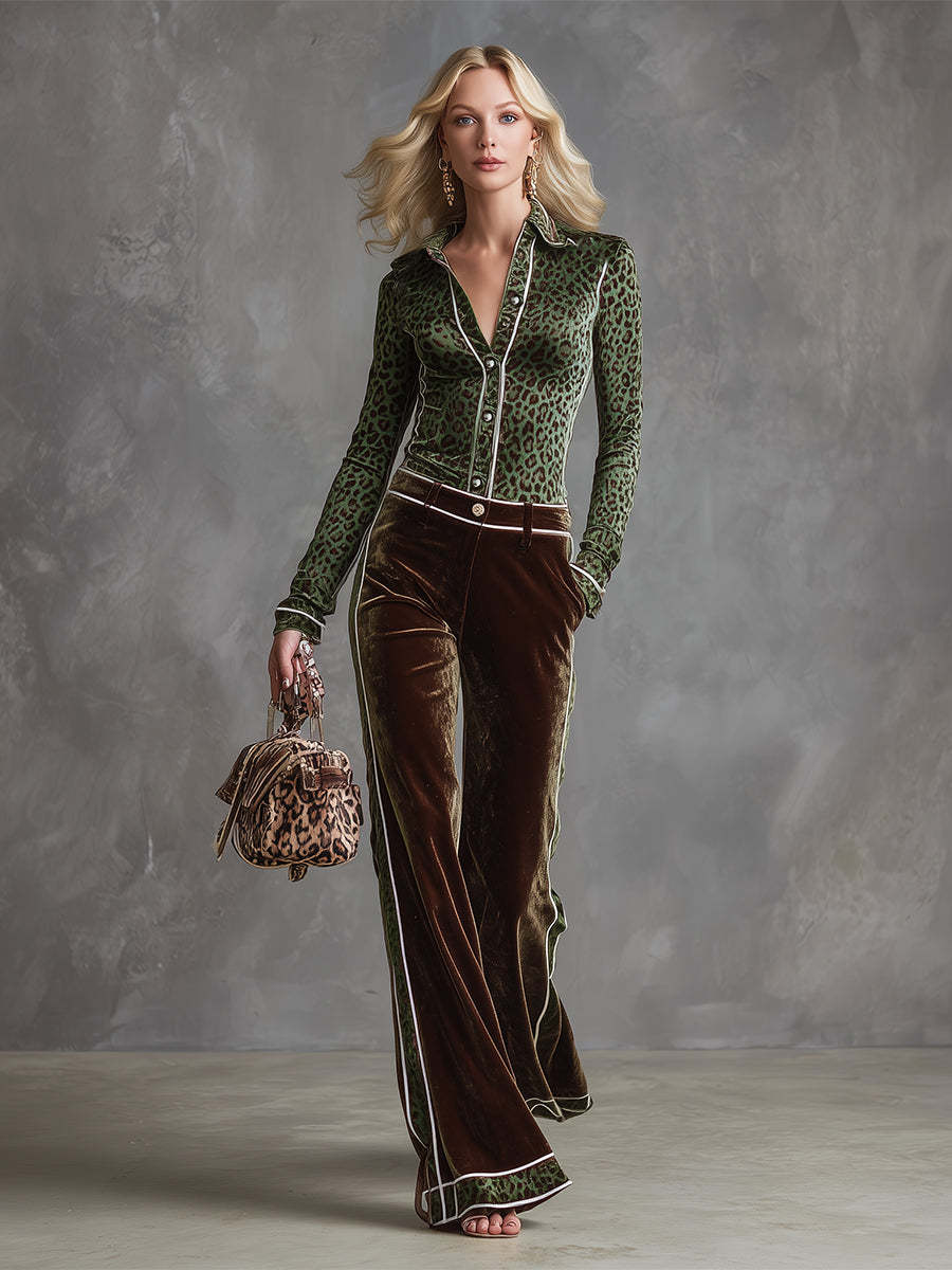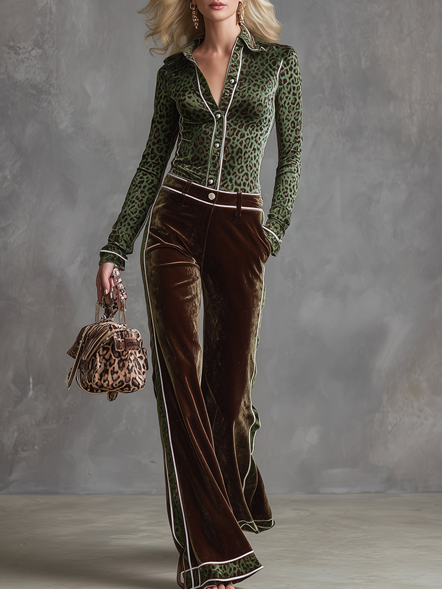 Stylish Urban Green Leopard Print Brown Wide-leg Velvet Set