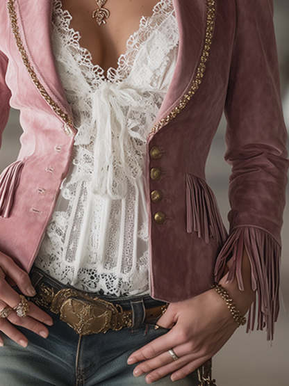 Stylish Urban Pink Faux Suede Fringed Slim-fit Blazer