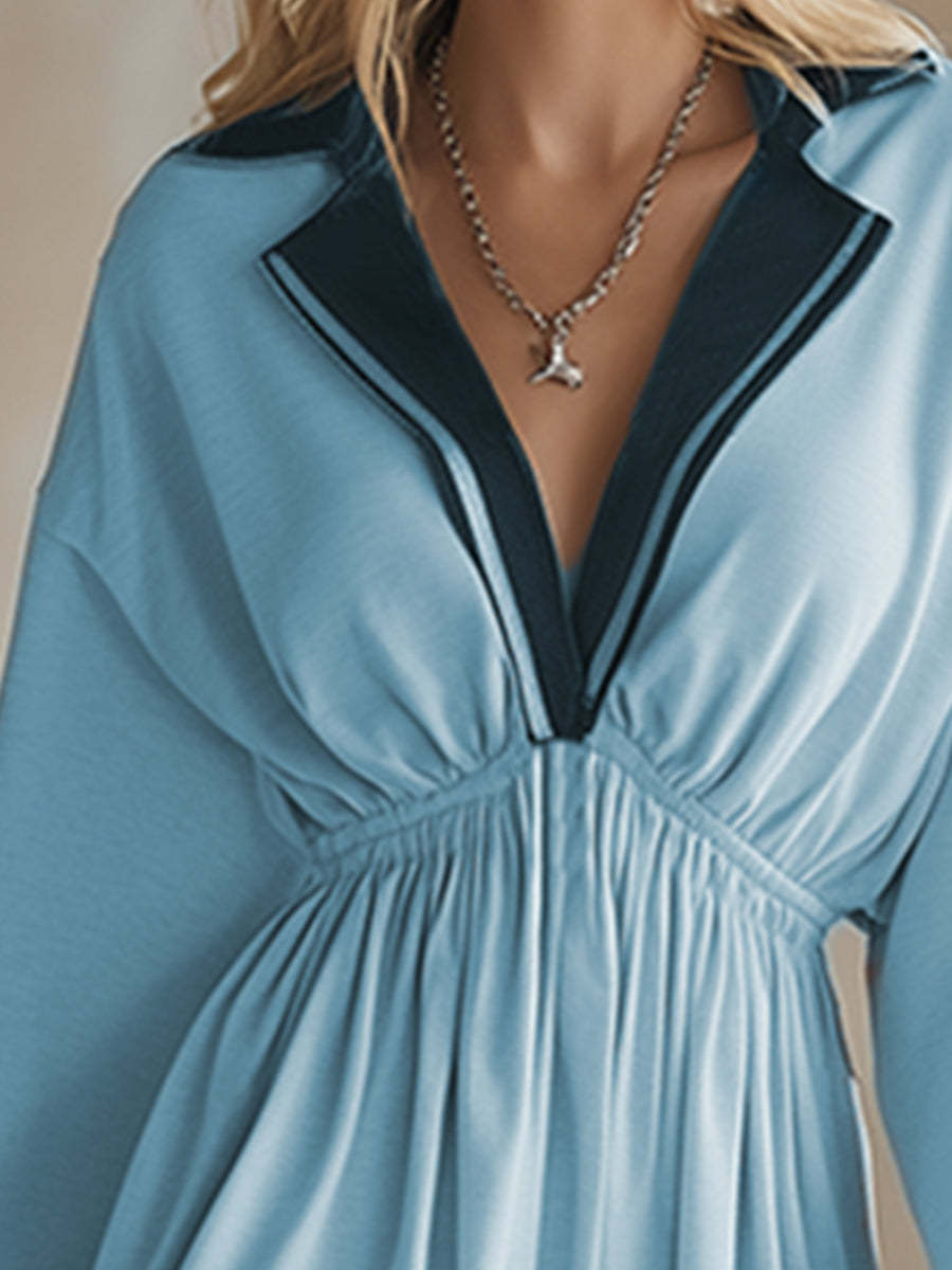 Trendy Sporty Color-blocked Collared Sky Blue Loose Sweatshirt Mini Dress