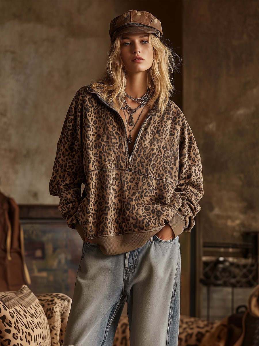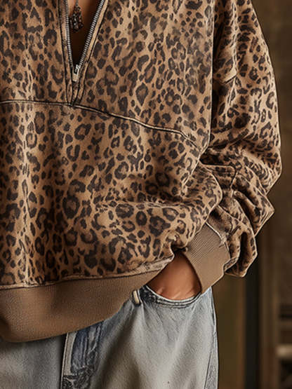 Trendy Sporty Half-Zip Loose Leopard Print Sweatshirt
