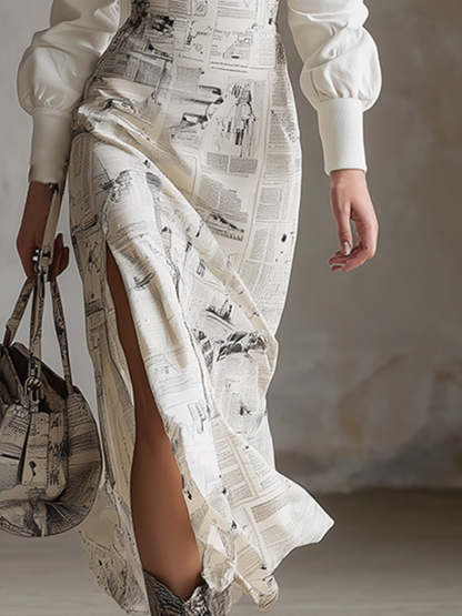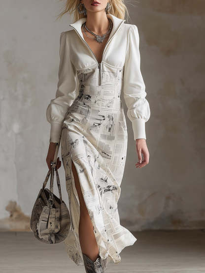 Trendy Urban Sporty White Collared Half-zip Newspaper Print Sweatshirt Maxi Dress