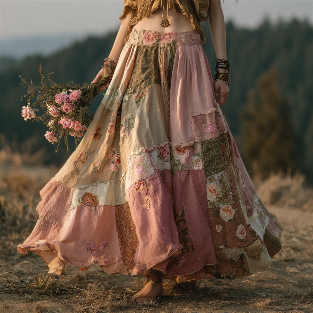 Vintage Boho Floral Patchwork Art Women's Flowing Maxi Dress