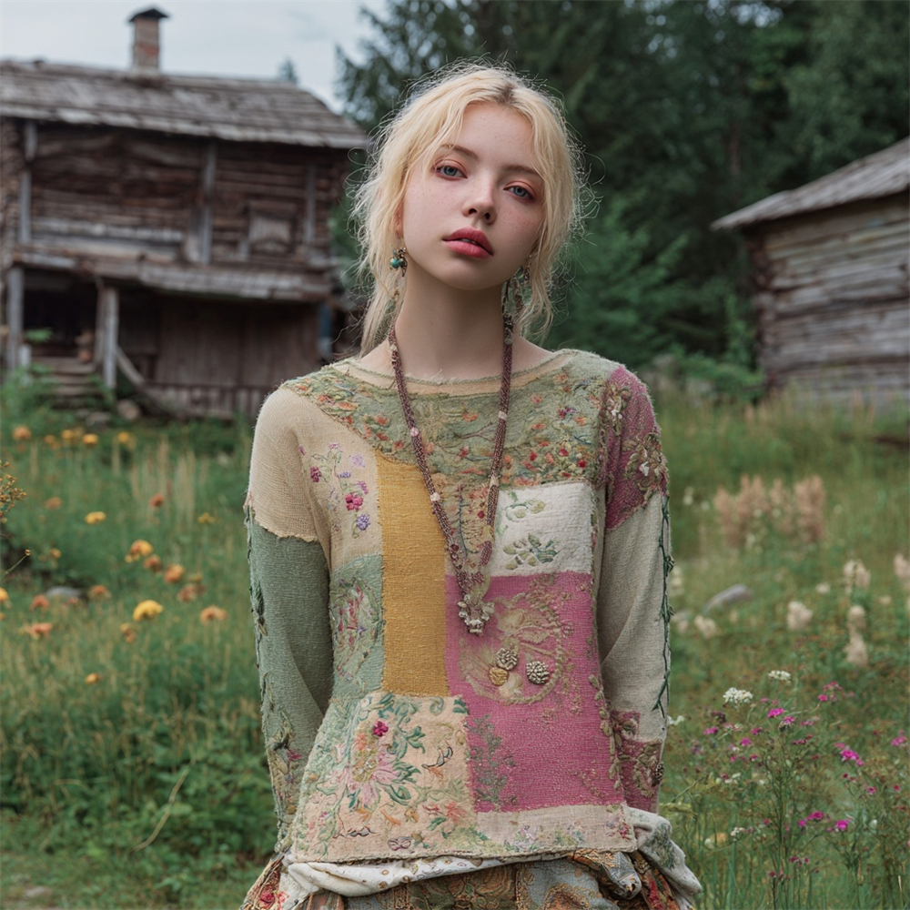 Vintage Boho Floral Patchwork Art Women's Knit Crew Neck Sweater