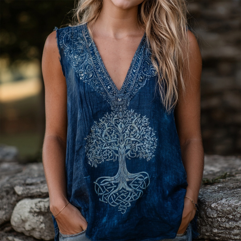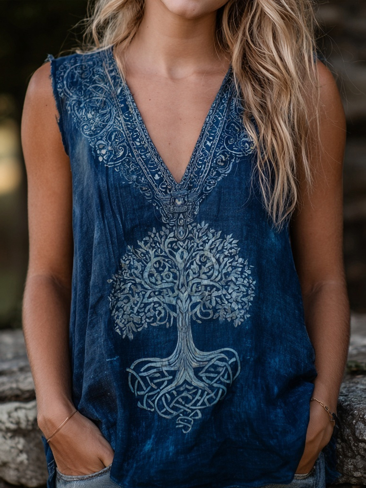 Vintage Celtic Tree Of Life Indigo Batik Art Linen Tank