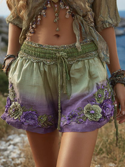 Vintage Classy Gradient Purple Lavender And Floral Embroidered Linen Shorts