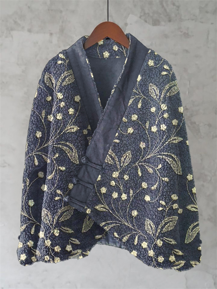 Vintage Embroidered Floral Art Print Wool Kimono Cardigan