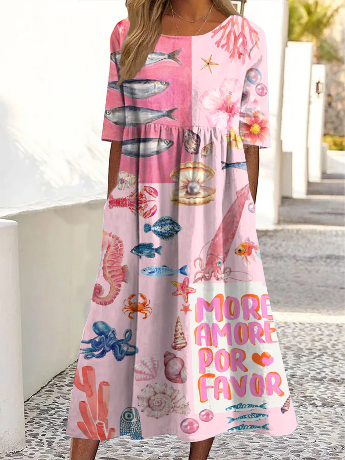Vintage Fish Print Round Neck Pocket Midi Dress