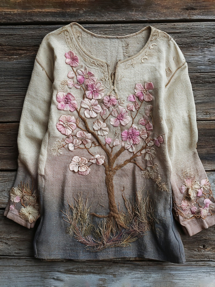 Vintage Floral Embroidery Women's Linen Long Sleeve Shirt