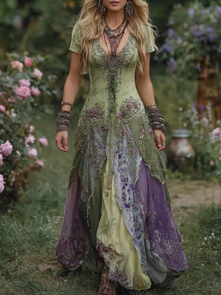 Vintage Gradient Purple Floral Embroidered Linen Maxi Dress