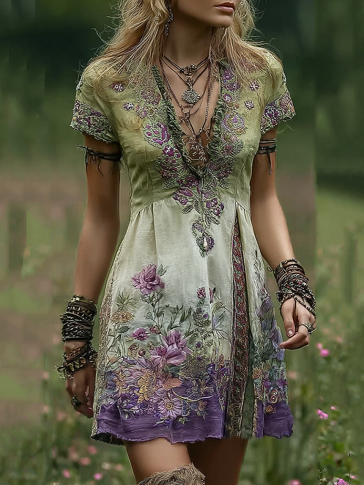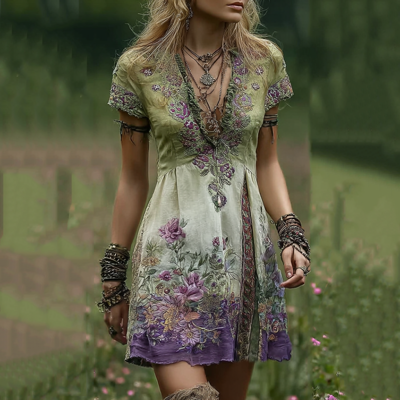 Vintage Gradient Purple Floral Embroidered Patchwork Linen Midi Dress